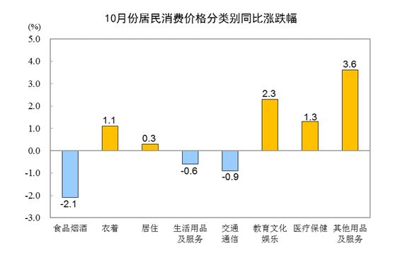 10月份,食品烟酒类价格环比下降0.4%,影响CPI下降约0.12个百分点。食品中,蛋类价格下降3.6%,影响CPI下降约0.03个百分点;鲜菜价格下降1.9%,影响CPI下降约0.04个百分点;水产品价格下降1.4%,影响CPI下降约0.03个百分点;畜肉类价格下降1.0%,影响CPI下降约0.03个百分点,其中猪肉价格下降2.0%,影响CPI下降约0.03个百分点;鲜果价格上涨0.9%,影响CPI上涨约0.02个百分点。