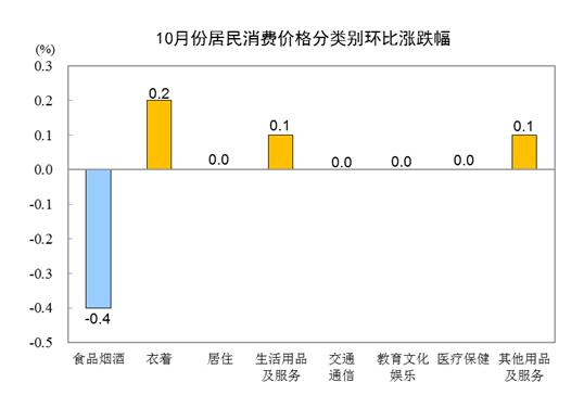 10月份,全国居民消费价格环比下降0.1%。其中,城市下降0.1%,农村下降0.1%;食品价格下降0.8%,非食品价格持平;消费品价格下降0.1%,服务价格下降0.1%。
