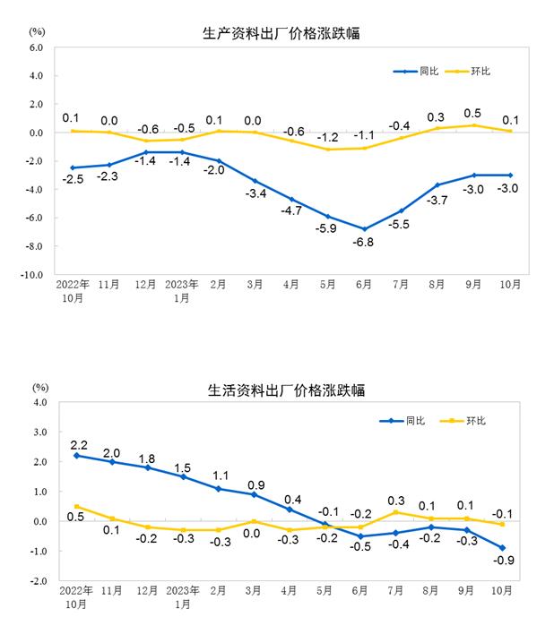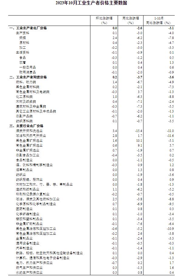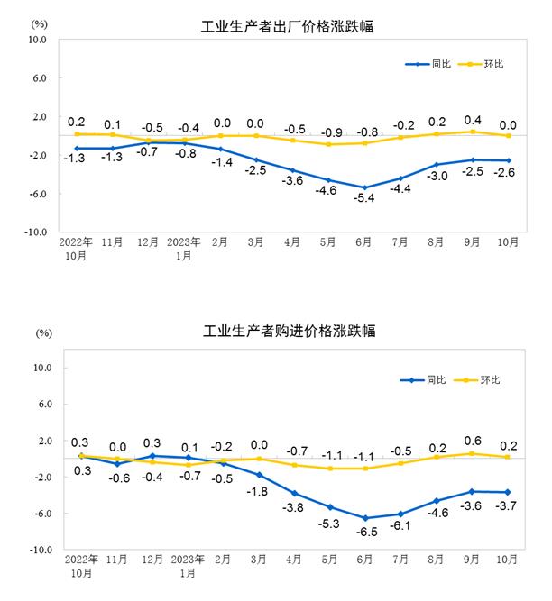 2023年10月份,全国工业生产者出厂价格同比下降2.6%,环比持平;工业生产者购进价格同比下降3.7%,环比上涨0.2%。1—10月平均,工业生产者出厂价格比上年同期下降3.1%,工业生产者购进价格下降3.6%。
