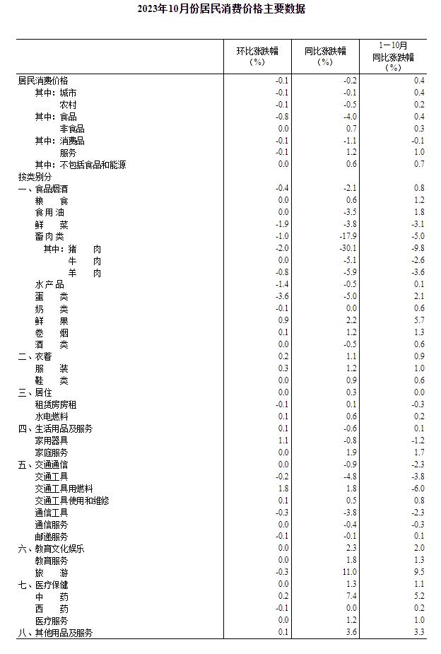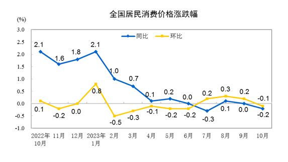 2023年10月份居民消费价格同比下降0.2% 环比下降0.1%