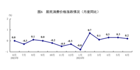 上半年,全国居民消费价格(CPI)同比上涨0.1%,一季度为同比持平。分类别看,食品烟酒价格下降1.4%,衣着价格上涨1.6%,居住价格上涨0.2%,生活用品及服务价格上涨0.9%,交通通信价格下降0.7%,教育文化娱乐价格上涨2.0%,医疗保健价格上涨1.4%,其他用品及服务价格上涨3.3%。在食品烟酒价格中,鲜果价格下降7.8%,鲜菜价格下降2.7%,猪肉价格持平,粮食价格上涨0.5%。扣除食品和能源价格后的核心CPI同比上涨0.7%。6月份,全国居民消费价格同比上涨0.2%,环比下降0.2%。