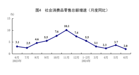 上半年,社会消费品零售总额235969亿元,同比增长3.7%。按经营单位所在地分,城镇消费品零售额204559亿元,增长3.6%;乡村消费品零售额31410亿元,增长4.5%。按消费类型分,商品零售209726亿元,增长3.2%;餐饮收入26243亿元,增长7.9%。部分基本生活类和升级类商品销售良好,限额以上单位粮油食品类、饮料类商品零售额分别增长9.6%、5.6%;通讯器材类、体育娱乐用品类商品零售额分别增长11.3%、11.2%。全国网上零售额70991亿元,同比增长9.8%。其中,实物商品网上零售额59596亿元,增长8.8%,占社会消费品零售总额的比重为25.3%。6月份,社会消费品零售总额同比增长2.0%,环比下降0.12%。上半年,服务零售额同比增长7.5%。