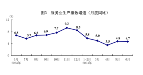 上半年,服务业增加值同比增长4.6%。其中,信息传输、软件和信息技术服务业,租赁和商务服务业,交通运输、仓储和邮政业,住宿和餐饮业,批发和零售业增加值分别增长11.9%、9.8%、6.9%、6.6%、5.7%。6月份,全国服务业生产指数同比增长4.7%。其中,信息传输、软件和信息技术服务业,租赁和商务服务业,交通运输、仓储和邮政业生产指数分别增长13.5%、9.7%、5.4%。1-5月份,规模以上服务业企业营业收入同比增长8.5%。6月份,服务业商务活动指数为50.2%;服务业业务活动预期指数为57.6%,比上月上升0.6个百分点。其中,航空运输、邮政、电信广播电视及卫星传输服务、货币金融服务、保险等行业商务活动指数位于55.0%以上较高景气区间。