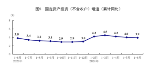 上半年,全国固定资产投资(不含农户)245391亿元,同比增长3.9%;扣除房地产开发投资,全国固定资产投资增长8.5%。分领域看,基础设施投资增长5.4%,制造业投资增长9.5%,房地产开发投资下降10.1%。全国新建商品房销售面积47916万平方米,同比下降19.0%;新建商品房销售额47133亿元,下降25.0%。分产业看,第一产业投资增长3.1%,第二产业投资增长12.6%,第三产业投资下降0.2%。民间投资增长0.1%;扣除房地产开发投资,民间投资增长6.6%。高技术产业投资同比增长10.6%,其中高技术制造业和高技术服务业投资分别增长10.1%、11.7%。高技术制造业中,航空、航天器及设备制造业,计算机及办公设备制造业投资分别增长38.3%、12.1%;高技术服务业中,电子商务服务业、科技成果转化服务业投资分别增长24.1%、17.4%。6月份,固定资产投资(不含农户)环比增长0.21%。
