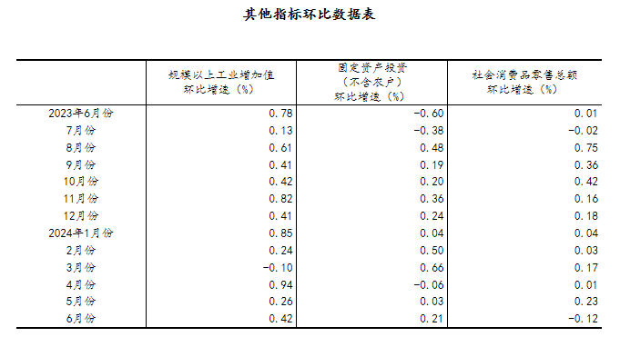 (2)根据季节调整模型自动修正结果,对近一年来各期国内生产总值、规模以上工业增加值、固定资产投资(不含农户)、社会消费品零售总额环比增速进行修订。修订结果及2024年二季度GDP环比数据、2024年6月份其他指标环比数据如下: