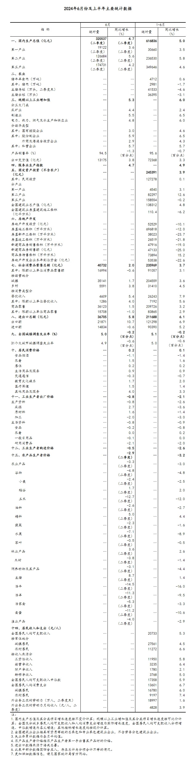 初步核算,上半年国内生产总值616836亿元,按不变价格计算,同比增长5.0%。分产业看,第一产业增加值30660亿元,同比增长3.5%;第二产业增加值236530亿元,增长5.8%;第三产业增加值349646亿元,增长4.6%。分季度看,一季度国内生产总值同比增长5.3%,二季度增长4.7%。从环比看,二季度国内生产总值增长0.7%。