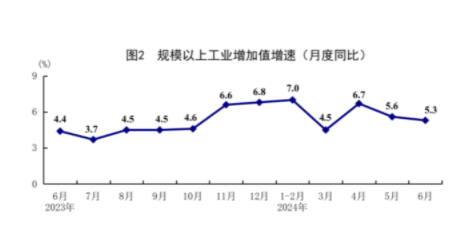 上半年,全国规模以上工业增加值同比增长6.0%。分三大门类看,采矿业增加值增长2.4%,制造业增长6.5%,电力、热力、燃气及水生产和供应业增长6.0%。装备制造业增加值增长7.8%,高技术制造业增加值增长8.7%,增速分别快于全部规模以上工业1.8和2.7个百分点。分经济类型看,国有控股企业增加值增长4.6%;股份制企业增长6.5%,外商及港澳台投资企业增长4.3%;私营企业增长5.7%。分产品看,3D打印设备、新能源汽车、集成电路产品产量同比分别增长51.6%、34.3%、28.9%。6月份,规模以上工业增加值同比增长5.3%,环比增长0.42%。6月份,制造业采购经理指数为49.5%,与上月持平;企业生产经营活动预期指数为54.4%,比上月上升0.1个百分点。1-5月份,全国规模以上工业企业实现利润总额27544亿元,同比增长3.4%。