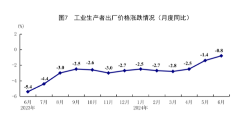 上半年,全国工业生产者出厂价格同比下降2.1%,降幅比一季度收窄0.6个百分点。其中,6月份同比下降0.8%,环比下降0.2%。上半年,工业生产者购进价格同比下降2.6%。其中,6月份同比下降0.5%,环比上涨0.1%。