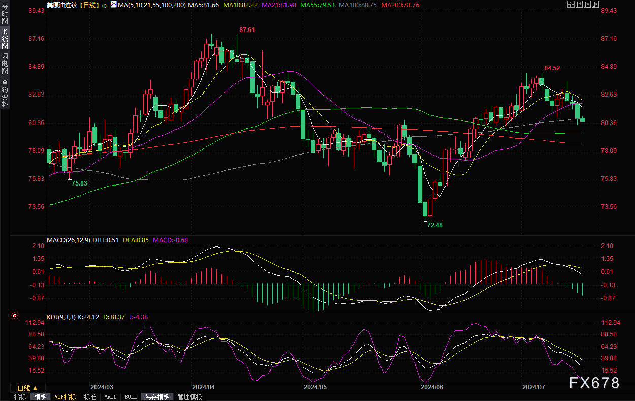 油价周二收跌超过1%,为连续第三天下跌,收报于近三周低位,市场担心亚洲大国经济放缓会抑制需求,不过对美联储最快可能在9月开始下调关键利率的共识日益增强,抑制了油价跌幅。技术面短线看空信号有所增强,美原油后市偏向进一步下探55日均线79.54和200日均线78.76附近支撑。
