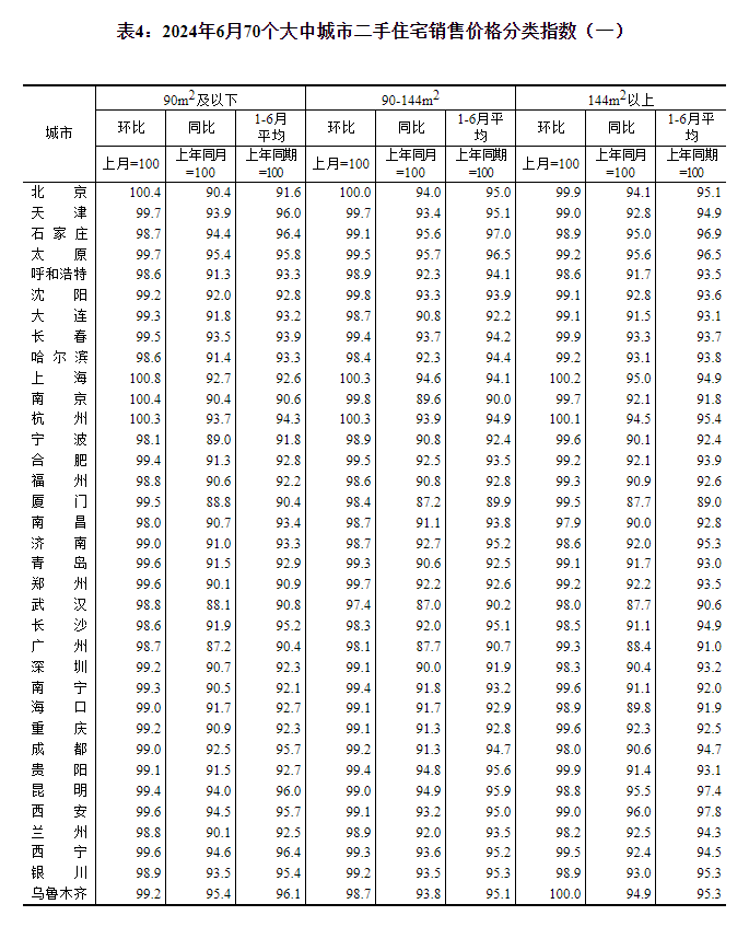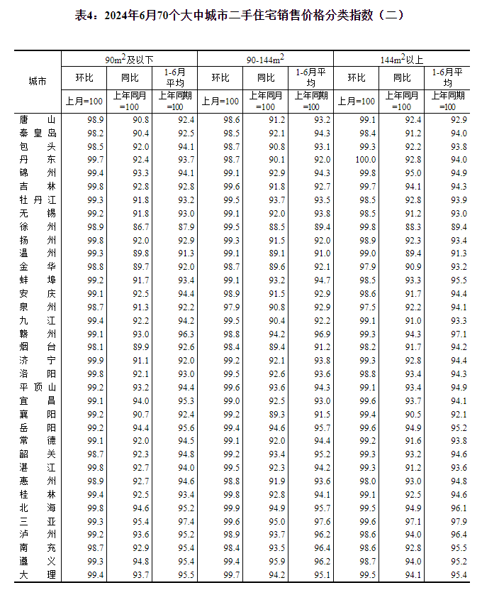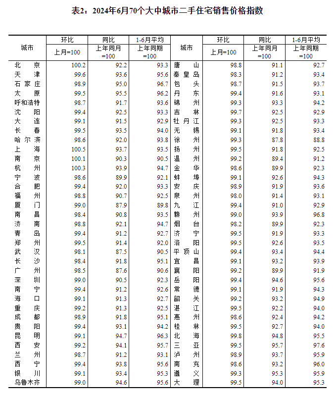 2024年6月份,70个大中城市中,各线城市商品住宅销售价格环比降幅总体收窄;同比下降,其中一线城市二手住宅同比降幅收窄。