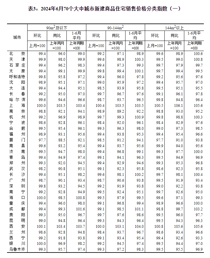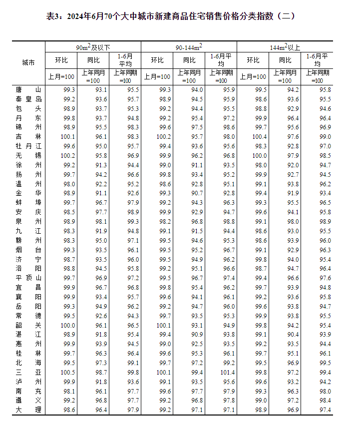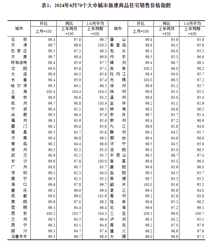 2024年6月份70个大中城市商品住宅销售价格变动情况