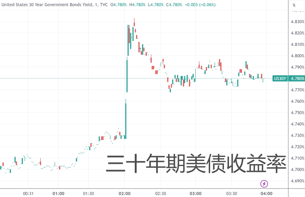 数据公布后,美债市场出现巨震。三十年期、十年期美债收益率都在几分钟内暴拉近10个基点。随后美国财政部和金融市场协会又传出消息称,由于潜在的网络攻击影响,美债市场的流动性可能也受到波及。