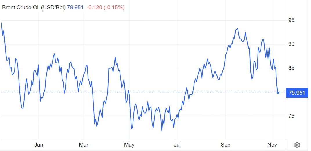 由于经济前景日益黯淡,尤其是在一些主要原油消费国,加之原油供应仍未受到以色列与巴勒斯坦哈马斯战争带来的影响,国际原油价格基准——布伦特原油期货价格本周跌至每桶80美元以下,这是三个月来该价格首次跌至80美元以下,目前徘徊在79美元附近。