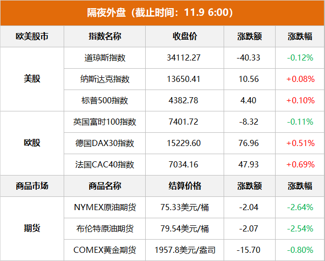 美股:道指下跌40.33点,收于34112.27点,跌幅为0.12%;标准普尔500种股票指数上涨4.40点,收于4382.78点,涨幅为0.10%;纳斯达克综合指数上涨10.56点,收于13650.41点,涨幅为0.08%。