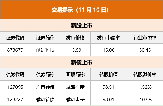 龙虎榜:11月9日,日内上榜龙虎榜个股中,资金净流入最多的是富乐德,三日净流入2.16亿元。机构参与龙虎榜中个券共涉及32只(1只可转债),其中11只个券(1只可转债)被机构净买入,天地在线被买入最多,为8564.55万元。另外21股被机构净卖出,光弘科技被卖出最多,为1.67亿元。