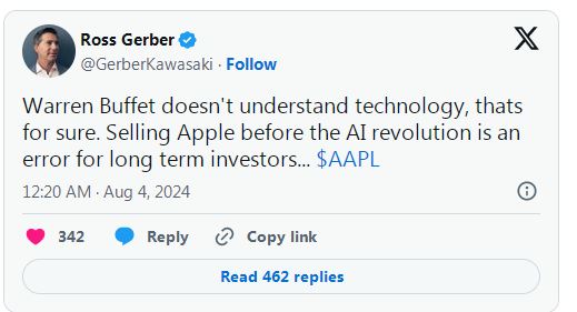 格伯写道:“巴菲特不懂技术,这是肯定的。对于长期投资者来说,在AI革命之前出售苹果是一个错误。”