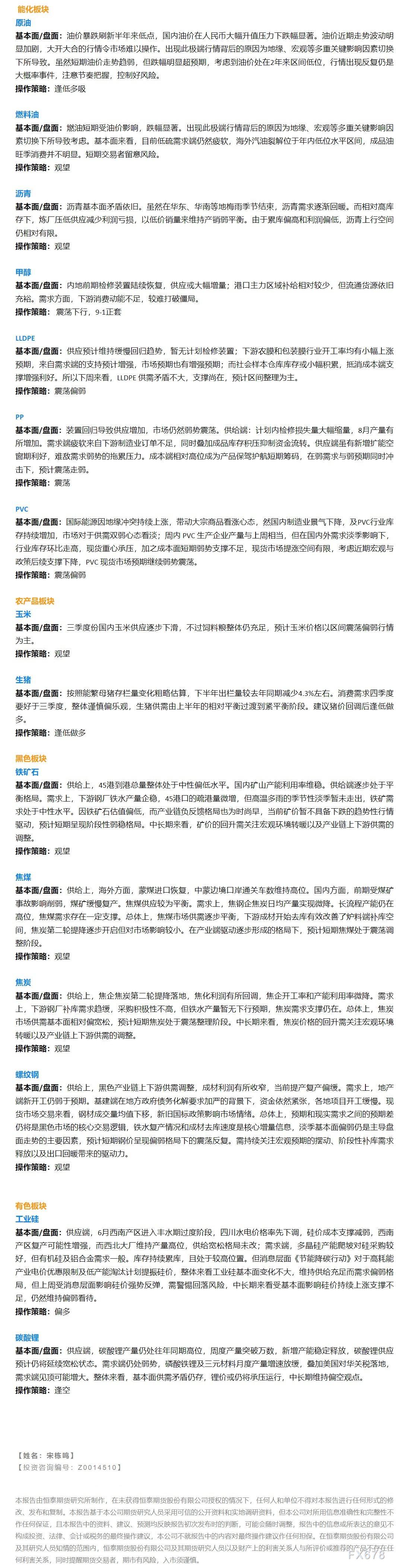 以下是恒泰期货今日早间交易策略,覆盖品种有:宏观分析、原油燃料油等能源化工、玉米生猪等农产品、黑色系如铁矿石焦煤焦炭螺纹钢、有色系如工业硅碳酸锂等。