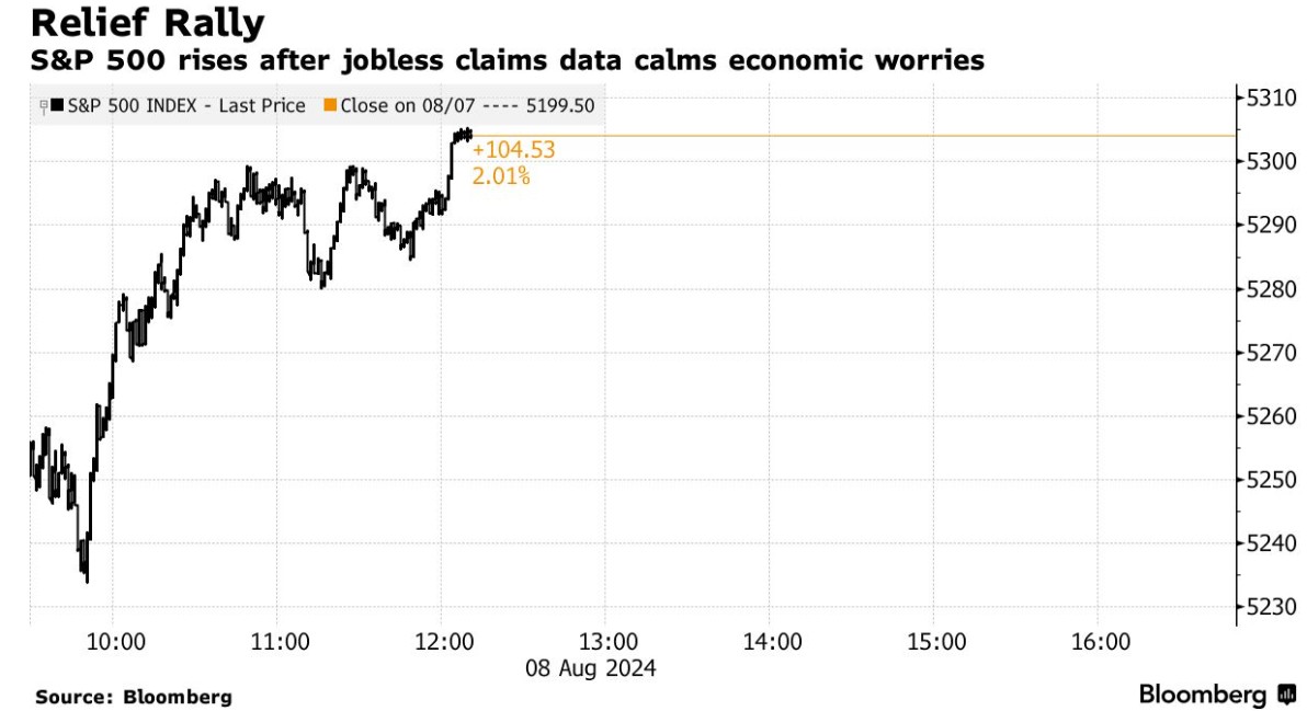 美国股市周四出现缓解性反弹,因为最新的美国劳动力市场数据有助于缓解人们对美国经济在上周公布的 7 月就业数据疲软后进一步放缓的担忧。标准普尔500 指数午盘上涨 1.9%,此前该指数周一创下近两年来最大单日跌幅。