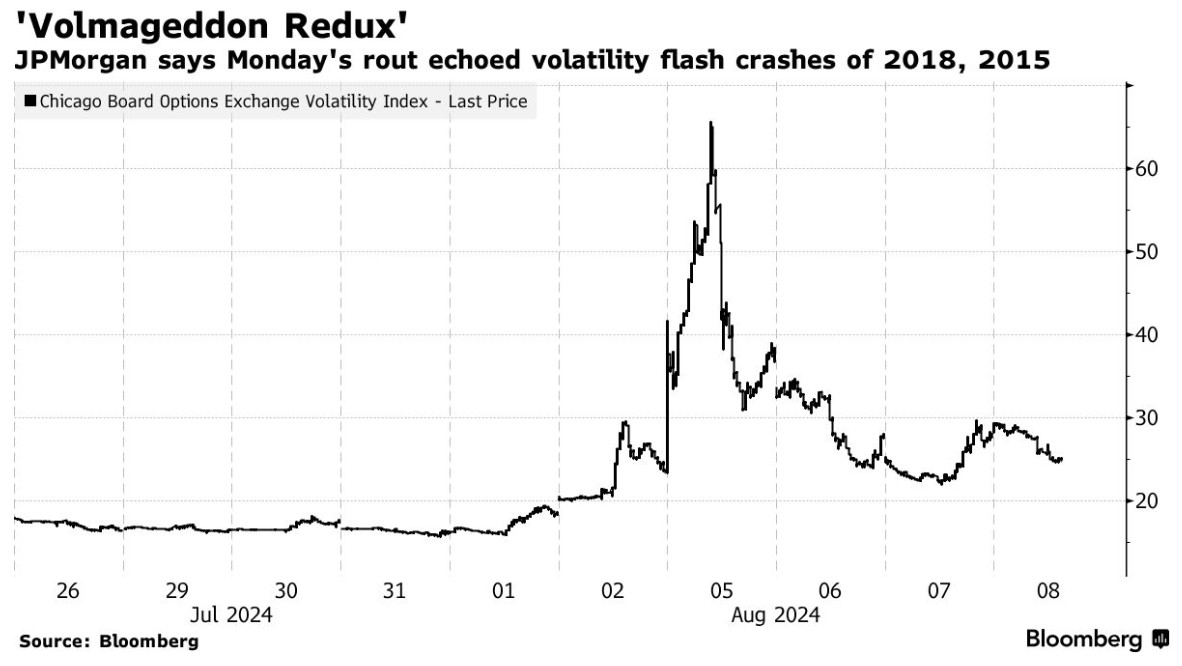 Lakos-Bujas认为,周一的波动是“波动率末日重演”。他表示,在大量抛售的情况下,芝加哥期权交易所波动率指数 ( VIX ) 飙升至 2020 年以来的最高水平,类似于 2018 年和 2015 年市场突然动荡时发生的闪电崩盘。科技巨头和人工智能宠儿的动量交易减弱、季节性疲软(8 月和 9 月历来是股市一年中最疲软的月份)以及美国大选的不确定性也导致了股市近期的挣扎。