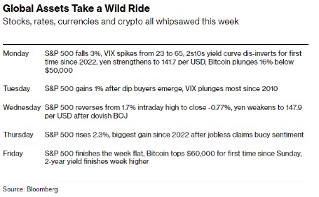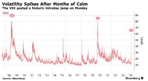 周一:标普500指数下跌3%,VIX指数从23点飙升至65点,2年期/10年期美债收益率曲线自2022年以来首次结束倒挂转正,日股创下史上最大单日点数跌幅,日元兑美元暴涨至141.7,比特币大跌16%至5万美元以下;