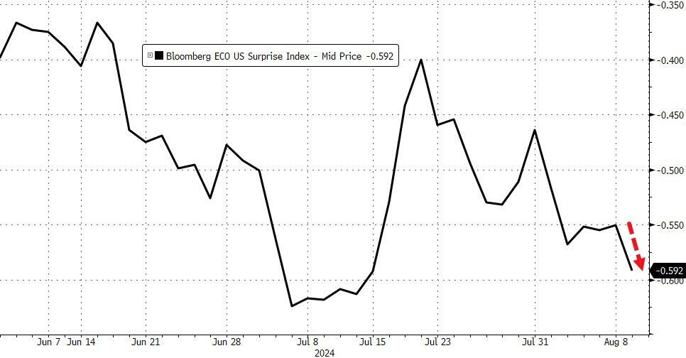 最新出炉的零售额飙升......这要归功于大量的历史修正和汽车销售的激增......但汽车产量正创下自新冠封锁以来最大跌幅(降低了GDP预期)......房屋建筑商信心下滑......费城联储商业前景暴跌......纽约联储制造业调查连续第9个月处于萎缩状态......进出口价格通胀高于预期......所有这些都正导致美国经济宏观惊奇指数跌向2024年的低点......