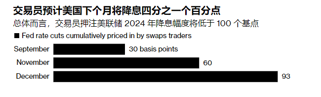 利率掉期合约显示,交易员在周四进一步减少了对美联储9月超大规模降息的押注,对下个月降息幅度的定价约为30个基点。他们现在还预计 2024年剩余时间内降息幅度总计为92个基点,低于零售数据公布前的100多个基点。
