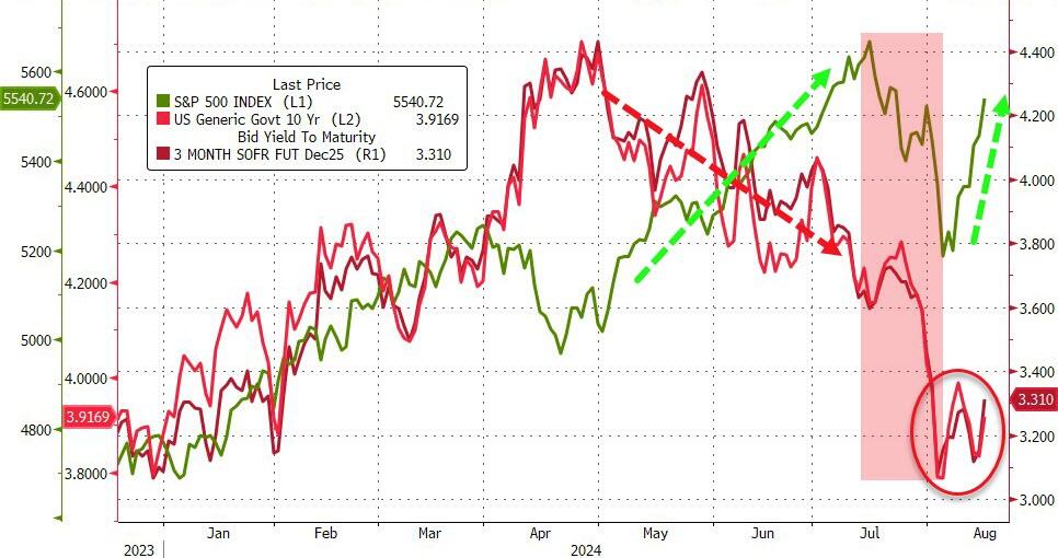 无论如何,尽管本周的数据表现,暂时化解了人们对经济衰退前景的部分忧虑,但眼下或许还未到彻底转危为安的时刻。一组对比显示,虽然美股过去一周多时间里出现了较为明显的反弹,但债券收益率和降息预期的变化幅度其实并不算大。