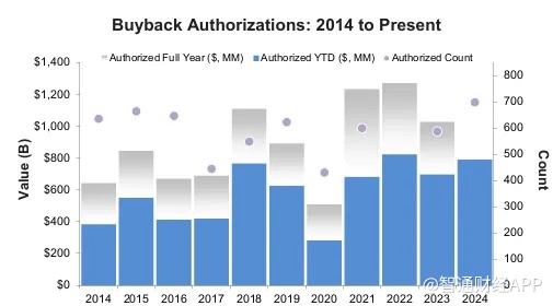 Birinyi编制的数据显示,美国公司已经宣布今年计划回购8260亿美元的股票,比上年同期高出15%。Rubin估计,2024年的实际回购规模可能超过1万亿美元。
