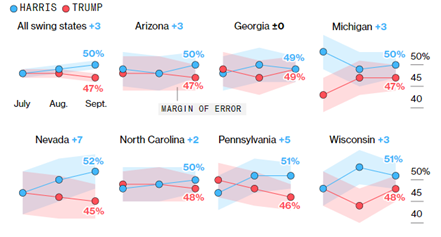 哈里斯在个别州的领先优势在民调统计误差范围内,这突显出这场激烈的竞争最终可能由最微弱的差距来决定。