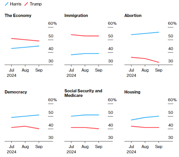 最新民调显示,目前在经济和移民问题上,特朗普仍处于领先位置,但经济方面的优势正在缩小;而在堕胎、民主、社保医保、以及住房问题上,哈里斯更胜一筹。