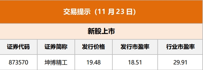 龙虎榜:11月22日,日内上榜龙虎榜个股中,资金净流入最多的是捷荣技术,为2.3亿元。机构参与龙虎榜中个券共涉及23只(1只可转债),其中9股被机构净买入,太极实业被买入最多,为6421.86万元。另外14只个券(1只可转债)被机构净卖出,元成股份被卖出最多,为7675.22万元。
