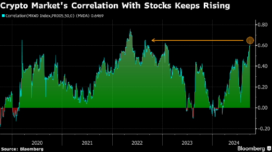 近期加密货币与股市的走势更加一致,这表明现阶段美联储货币政策前景等宏观因素对比特币而言至关重要。数据显示,衡量前100名数字代币和MSCI全球股票指数的50天相关系数为0.65,为2022年以来的最高水平。数值为1表示资产同步变动,负1则表示反向关联。