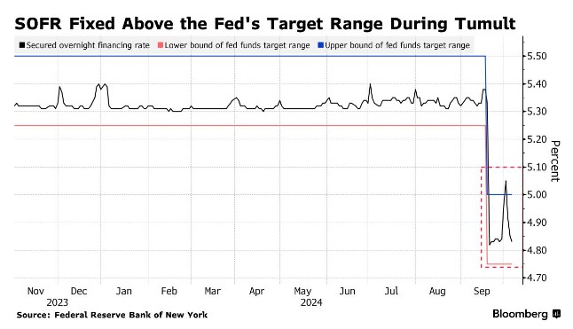 然后是美联储的常备回购便利(SRF),该机制允许符合条件的机构以符合美联储政策目标区间上限的利率(目前最低为5%)借入现金,以换取美国国债和机构债券。此举旨在为回购利率设定上限,但市场参与者质疑其有效性,因为隔夜回购已飙升至5.9%,而交易对手仅从SRF中提取了26亿美元。