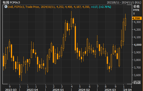在刚刚过去的一周,棕榈油市场经历了一系列波动,主要受到供需数据、原油价格以及全球植物油市场的竞争影响。根据最新数据,马来西亚衍生产品交易所的基准棕榈油合约在周五上涨了2.76%,收于每吨4350林吉特(约1015.41美元),实现了连续第四周的上涨。