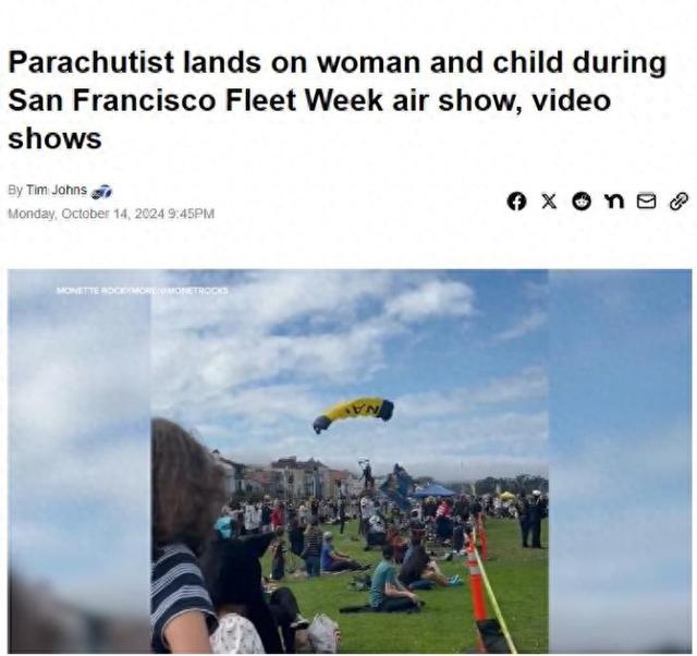 中新网10月15日电 据美国广播公司(ABC)报道,当地时间13日中午,美国旧金山举行的美国海军“舰队周”飞行表演期间发生意外,一名美国海军伞兵在伞降表演时错过着陆区,降落在一群观众当中,导致一名女性和她未成年的女儿受伤被送往医院。
