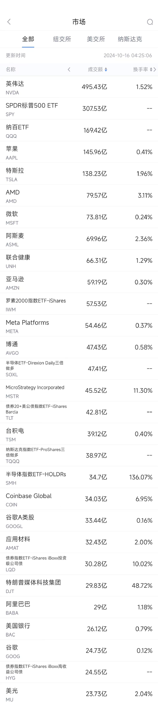 FXTM富拓集团资讯10月15日美股成交额前20:阿斯麦业绩暴雷带崩美股芯片股