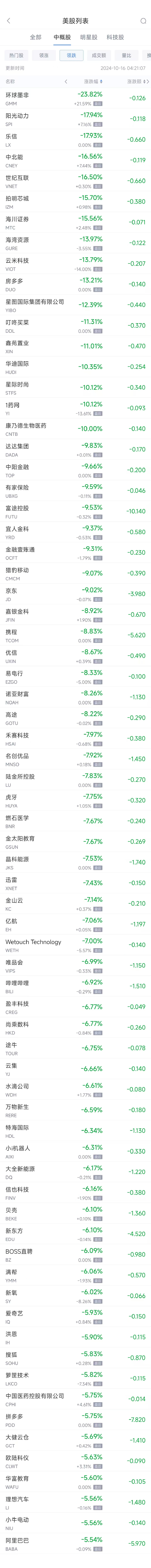下跌股当中(按市值降序排列),台积电跌2.62%,阿里巴巴跌5.53%,拼多多跌5.75%,京东跌9.02%,网易跌3.48%,携程跌8.83%,百度跌5.19%,理想汽车跌5.56%,贝壳跌6.15%,百济神州跌1.96%,腾讯音乐跌3.46%,中通跌4.47%,联电跌2.81%,富途控股跌9.53%,华住酒店集团跌3.62%,新东方跌6.07%,蔚来跌2.68%,小鹏汽车跌4.90%,满帮跌5.96%,哔哩哔哩跌6.92%,唯品会跌6.81%,BOSS直聘跌6.09%,WSP控股跌0.06%,名创优品跌7.90%,极氪跌4.74%,360数科跌5.07%,万国数据跌5.36%,汽车之家跌3.80%,亚朵集团跌3.51%,陆金所控股跌7.68%,爱奇艺跌5.93%。