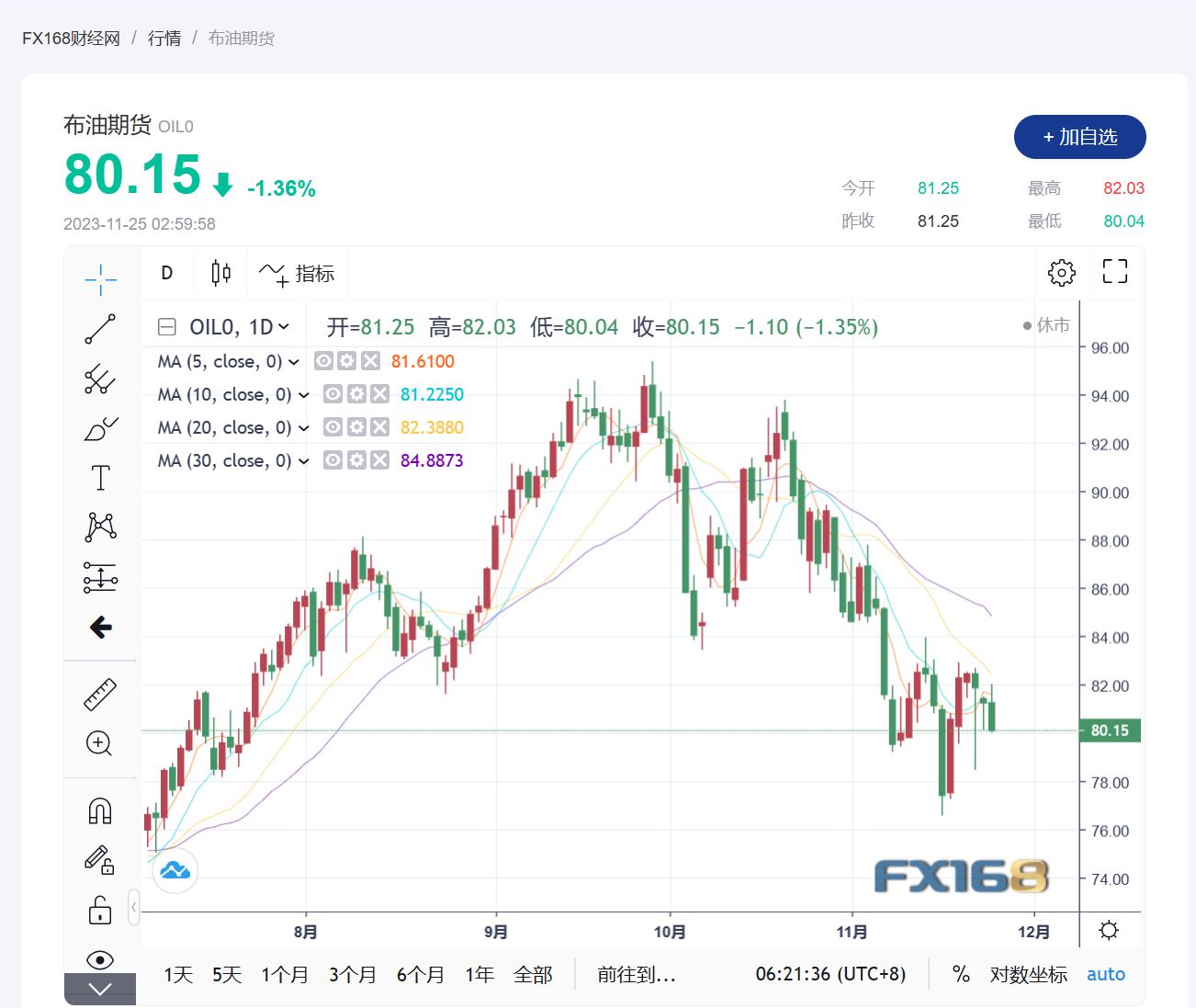布伦特原油期货下跌 0.84美元/桶,即 1%,收报80.58美元/桶。截至发稿,现报80.15美元/桶,跌幅1.36%。
