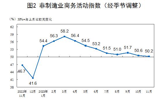11月份,非制造业商务活动指数为50.2%,比上月下降0.4个百分点,仍高于临界点,非制造业继续保持扩张。