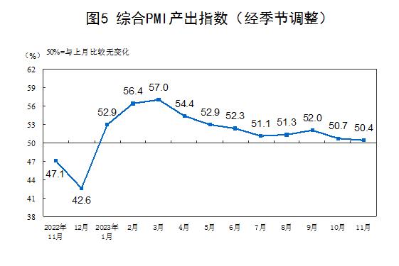 11月份,综合PMI产出指数为50.4%,比上月下降0.3个百分点,表明我国企业生产经营活动总体持续扩张。