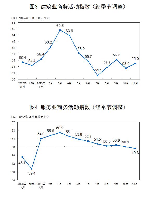 11月份,制造业采购经理指数、非制造业商务活动指数和综合PMI产出指数分别为49.4%、50.2%和50.4%,比上月下降0.1、0.4和0.3个百分点,我国经济景气水平稳中有缓,回升向好基础仍需巩固。
