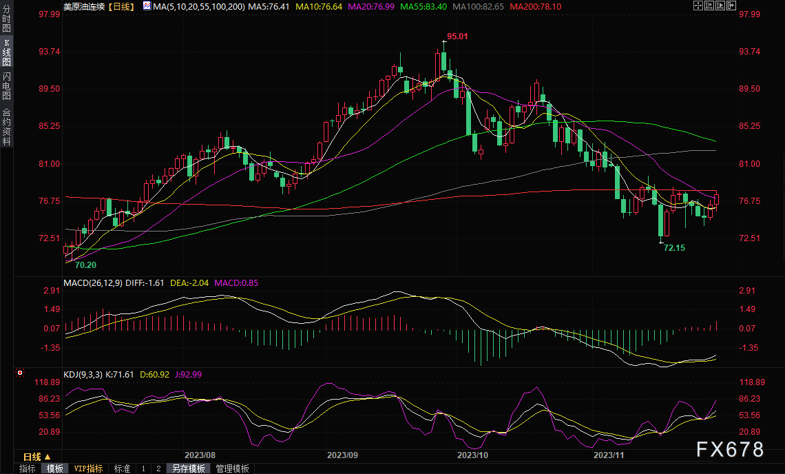投资者不再关注美国原油、汽油和馏分油库存的激增,而是将焦点投至即将召开的石油输出国组织(OPEC)和俄罗斯等盟国的会议,导致油价连续上涨趋势。 WTI 1月原油期货周三收涨1.45美元/桶,涨幅将近1.90%,收报77.86美元/桶,盘中曾刷新一周高点至78.07美元/桶,也正好是200日均线阻力所在。