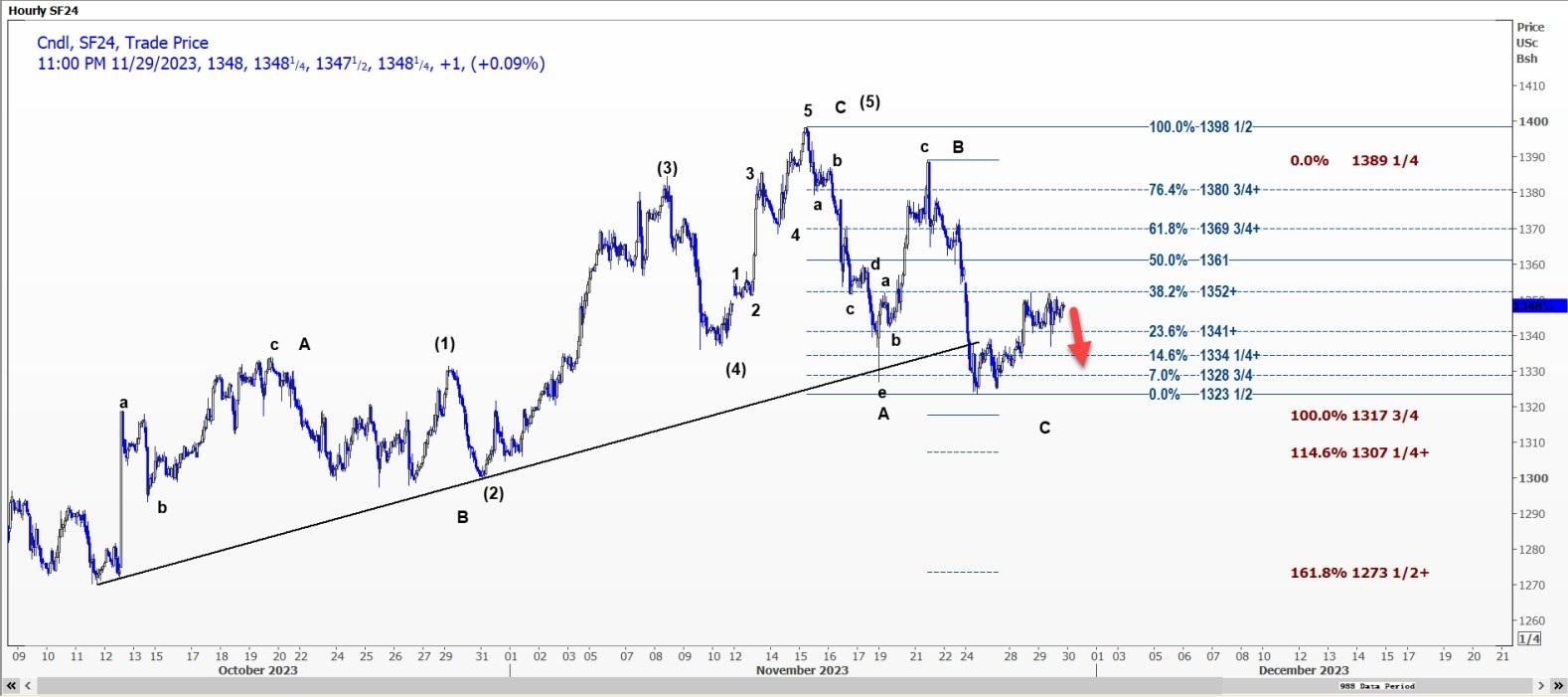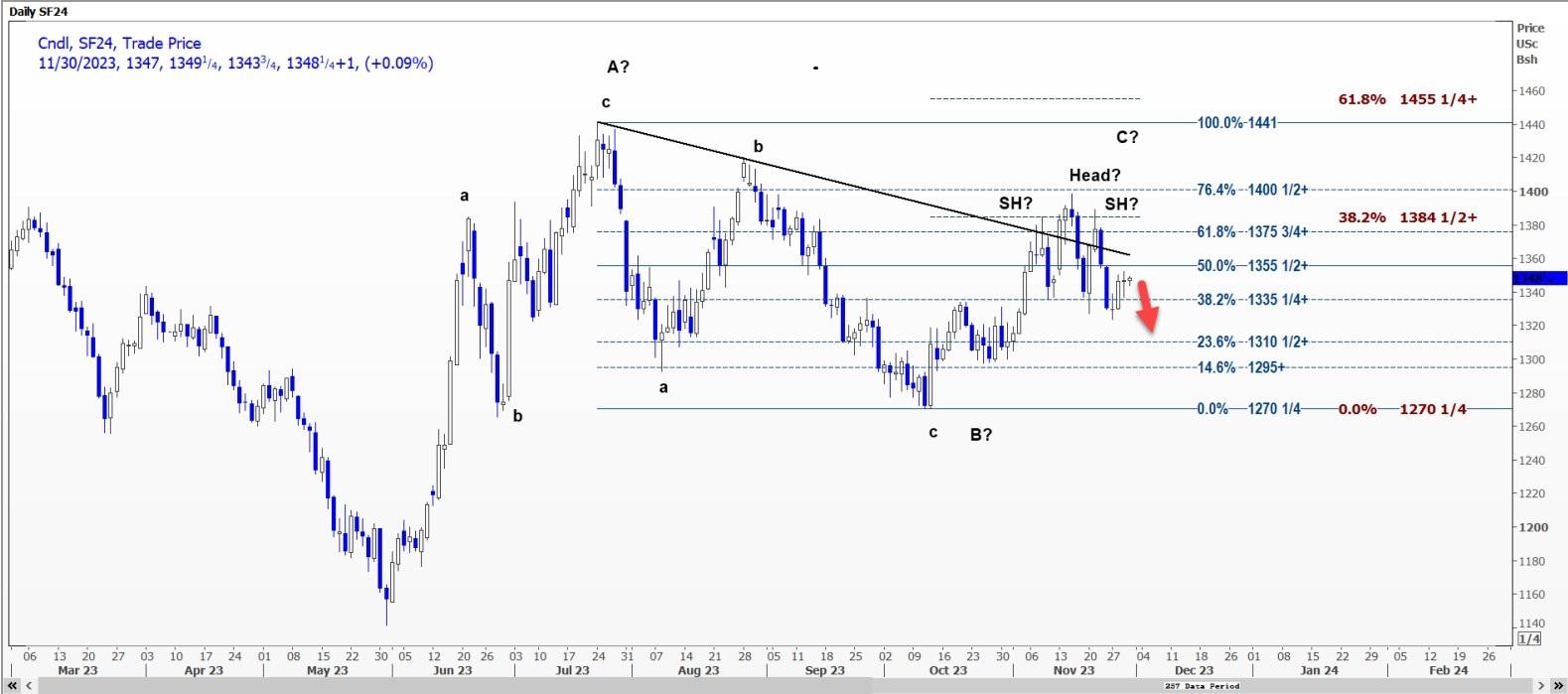 CBOT大豆1月合约SF24可能会重新测试每蒲式耳13.41美元的支撑位,跌破该支撑位可能会打开通往13.2350美元至13.3425美元区间的道路。