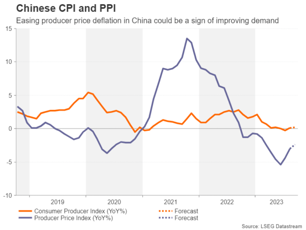 然而,英镑未能出现明显的反弹。这表明,投资者仍对英国的增长潜力感到悲观,而在英国央行出人意料地决定暂停加息之前,英镑/美元的主要优势是,英国利率将高于美国。 因此,本周四公布的一系列月度GDP产出和生产以及贸易数据料仅会引发膝跳反应,不太可能对英镑的近期前景产生重大影响。只要软着陆仍然是美国经济的基本情况,英国经济增长指标需要要么出现一系列上行意外,要么通胀出现下行意外,才能令英镑摆脱拖累其下跌的滞胀风险。 风险资产寄望于中国的提振 对于那些受到美元严重打压的货币的另一个希望是,风险情绪是否会出现好转。特别是,如果中国公布一些乐观的数据,澳元等对风险敏感的货币可能会收复近期的部分失地。然而,预测表明情况并非如此。 预计9月份中国生产者价格指数(PPI)同比下降2.4%,而8月份为下降3.0%,这表明对中国工厂生产的商品的需求略有改善。与此同时,预计CPI年率涨幅仅小幅上升至0.2%。