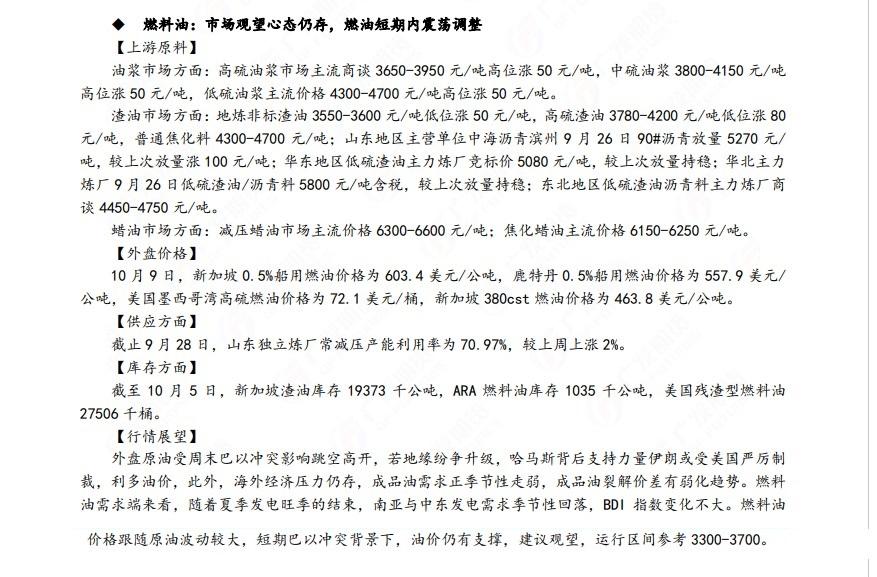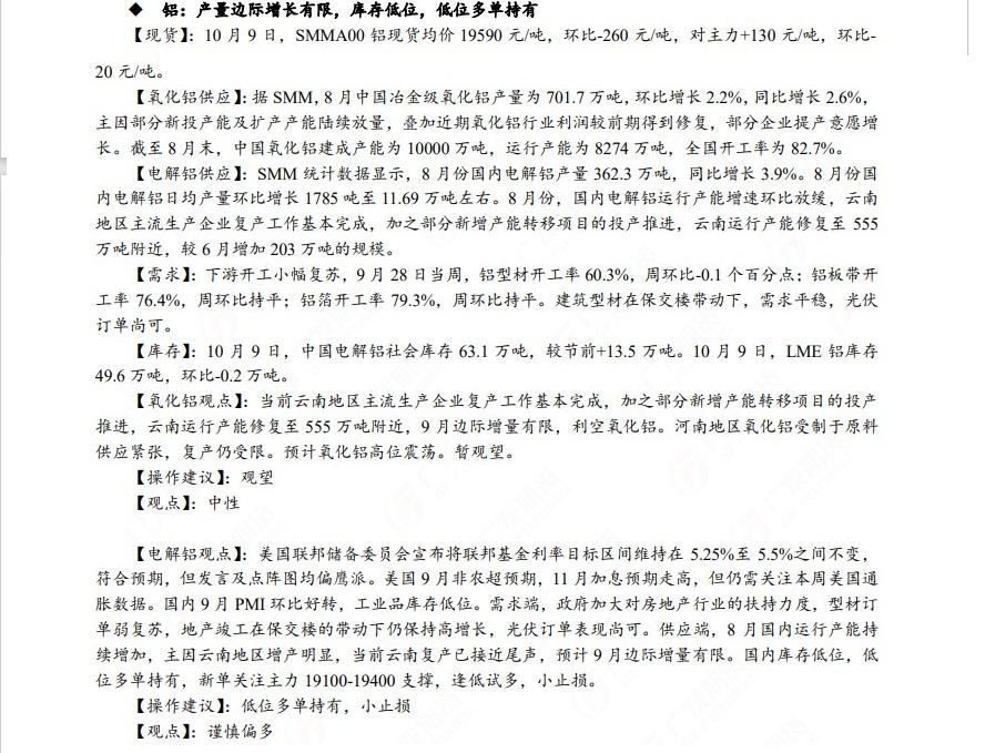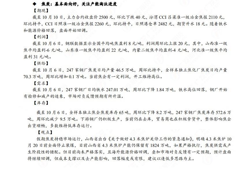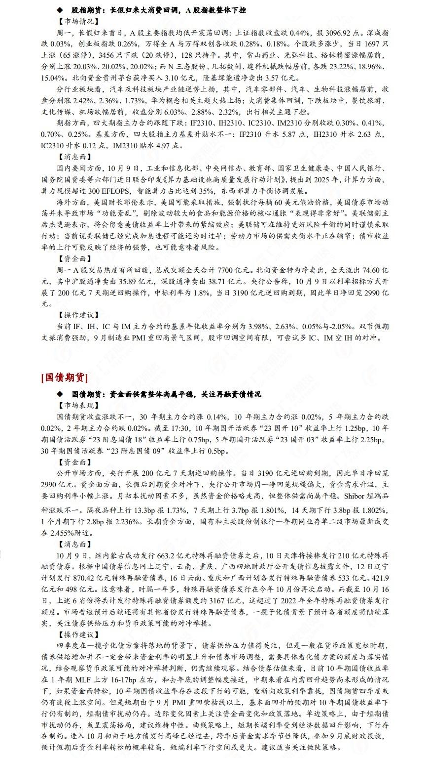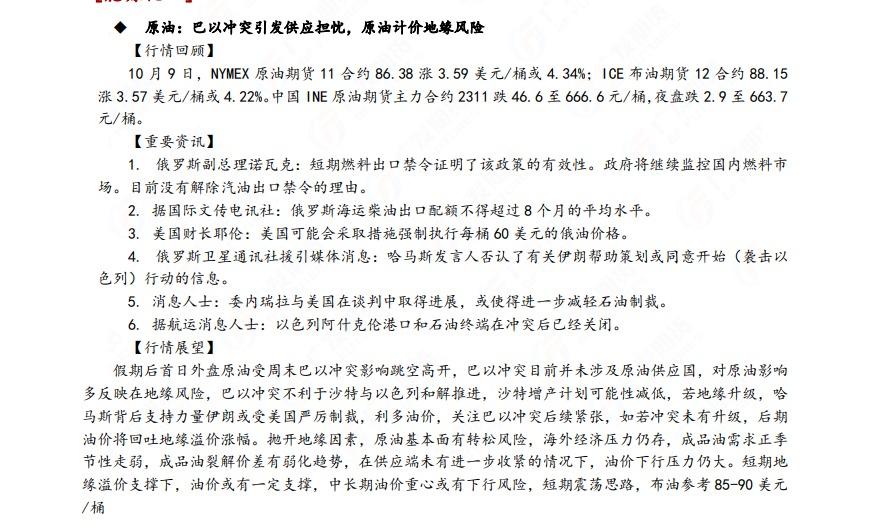 广发期货发布10月10日早知道,称股市回调空间有限,可尝试做多IC、IM空IH的对冲,国债期货建议适当关注做陡策略,铝谨慎偏多,焦炭以逢低多思路为主;原油短期在地缘溢价支撑下,价格或有一定支撑,中长期油价重心或有下行风险,短期震荡思路,布油参考85-90美元。