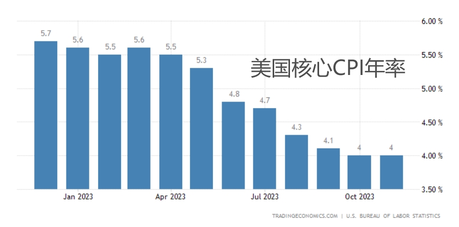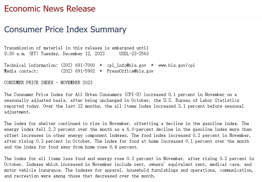 先看数据,11月美国名义CPI同比上涨3.1%,预期3.1%,与10月相比持平;去除食品、能源价格的核心CPI同比上涨4%,预期4%,与10月相比上涨0.3%。