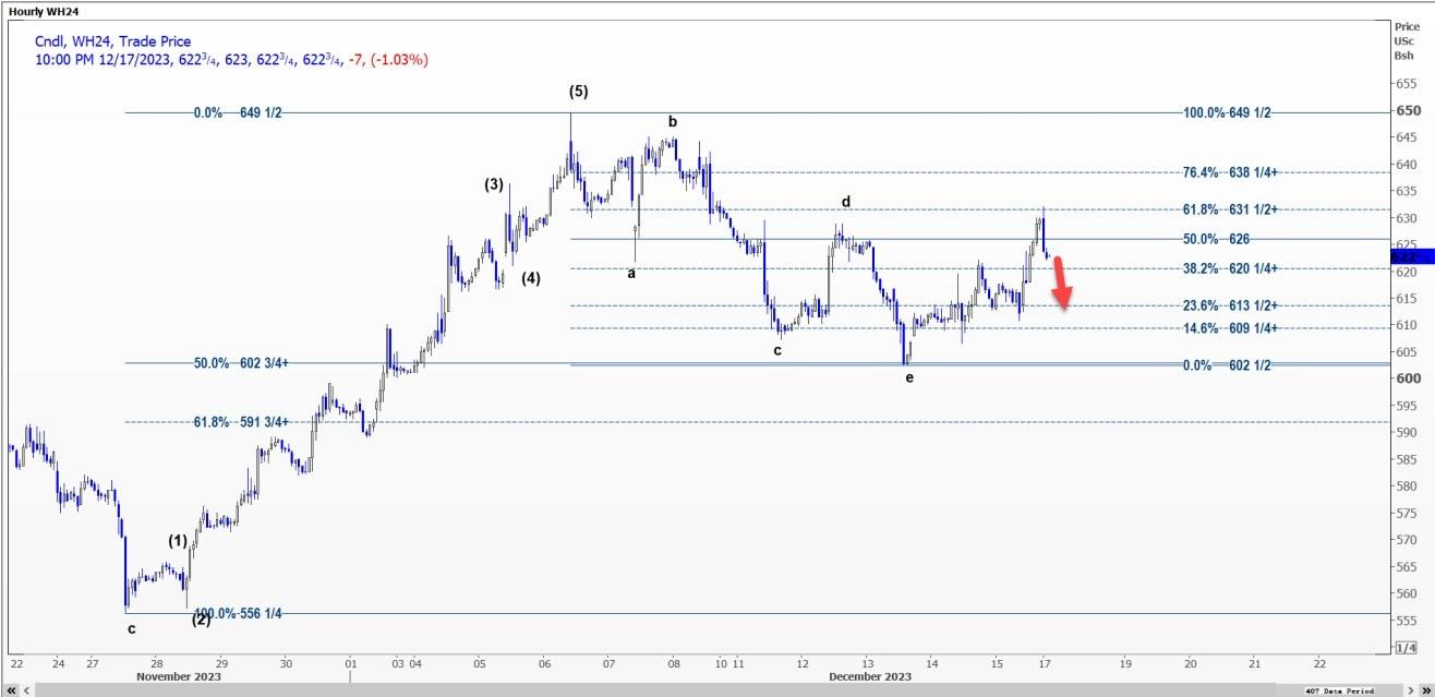 CBOT 3月小麦WH24可能会跌至每蒲式耳6.0925-6.1350美元的区间,因为从6.0250美元的反弹可能已经完成。