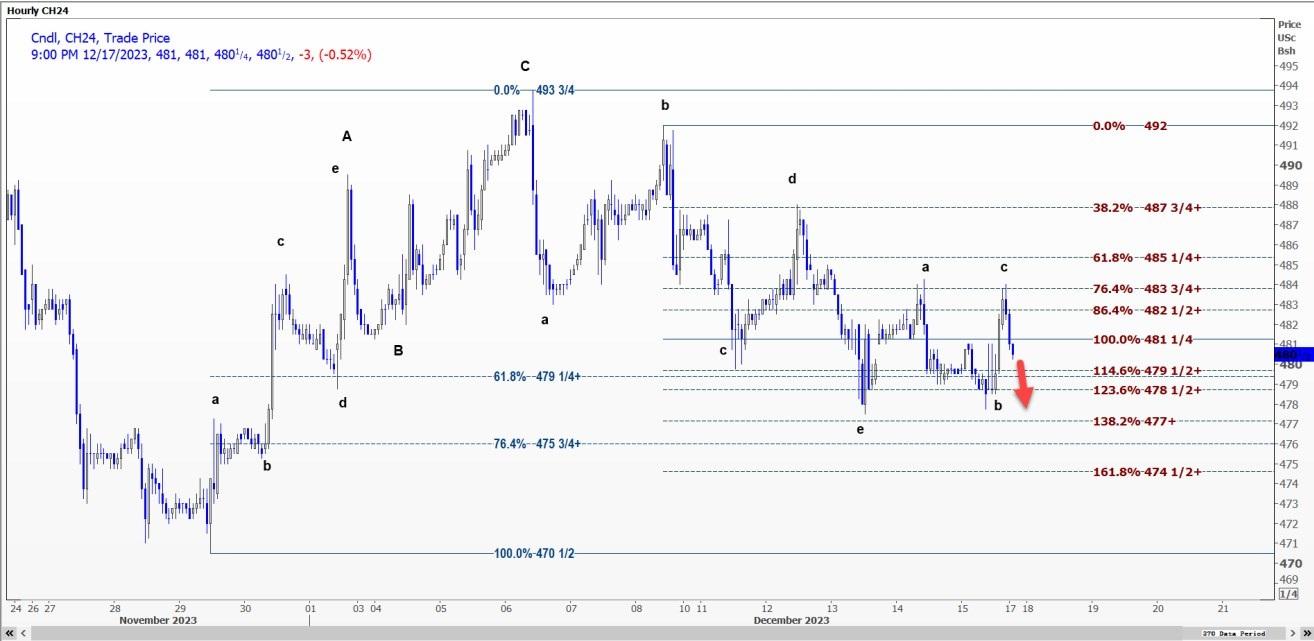 CBOT 3月玉米CH24可能测试每蒲式耳4.7950美元的支撑位,因为它已经突破了4.8125美元的较高支撑位。