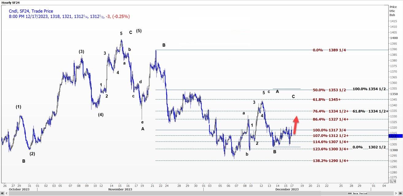 CBOT大豆1月合约SF24仍处于每蒲式耳13.2725-13.3450美元的区间,因为该合约正处于C浪中。