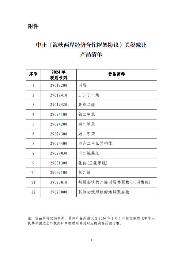 自2024年1月1日起,对原产于台湾地区的附件所列丙烯、对二甲苯等12个税目进口产品,中止适用《海峡两岸经济合作框架协议》协定税率,按现行有关规定执行。